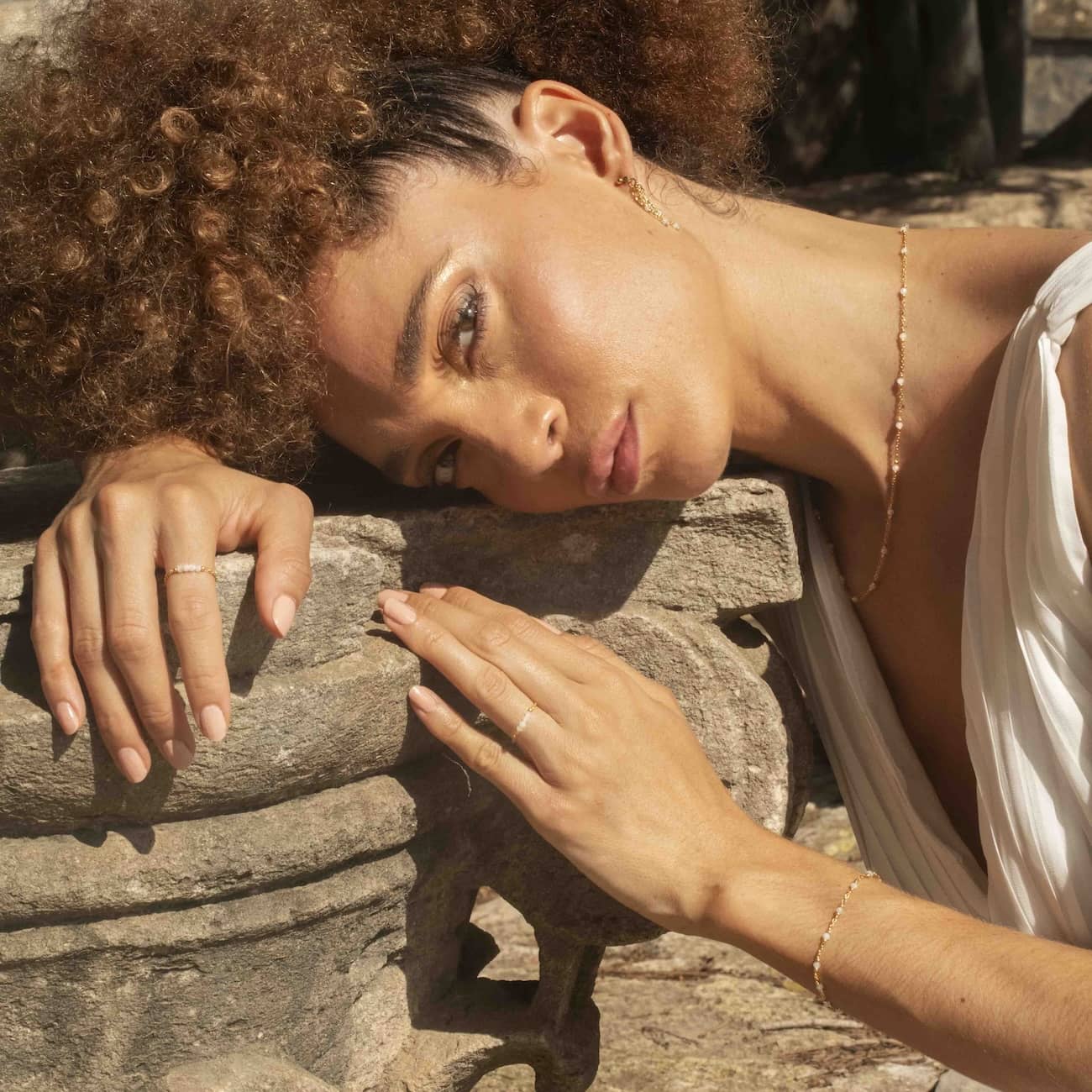 Déclinés sous six pierres différentes - le grenat, l’améthyste, le lapis-lazuli, la pierre de lune, la tourmaline rose et le péridot - les bagues chainettes, bracelets, colliers et boucles d’oreilles de la collection sont fabriqués à la main, pour un charme unique. Les pierres fines de 3 mm apportent une touche subtile de couleur, et l’éclat doré des bijoux évoque la chaleur des vestiges de Carthage sous le soleil méditerranéen.